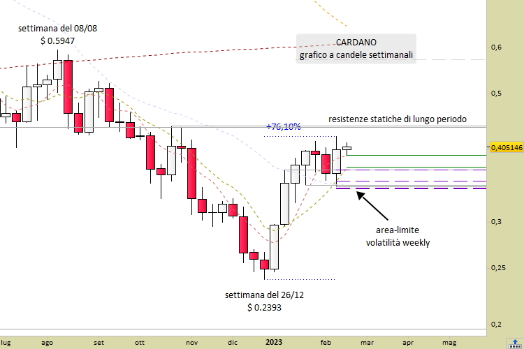 ADA/USD, grafico a candele settimanali. Prezzi fino al 20/02/23, ore 18.12, last 0.4051