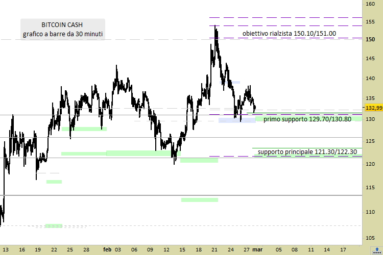 Il mese di febbraio è stato interessato dallo sviluppo di due fasi correttive in seno al trend rialzista che ancora sorregge questa crypto. Si è trattato di correzioni piuttosto ampie, di dimensioni contenute fra il 15.80-16.30%. L’ultima in ordine di tempo, di queste correzioni, è quella che si è sviluppata tra il 21 febbraio ed il 25 febbraio scorsi, sfociata nel raggiungimento dei già menzionati minimi di quota 129.58.