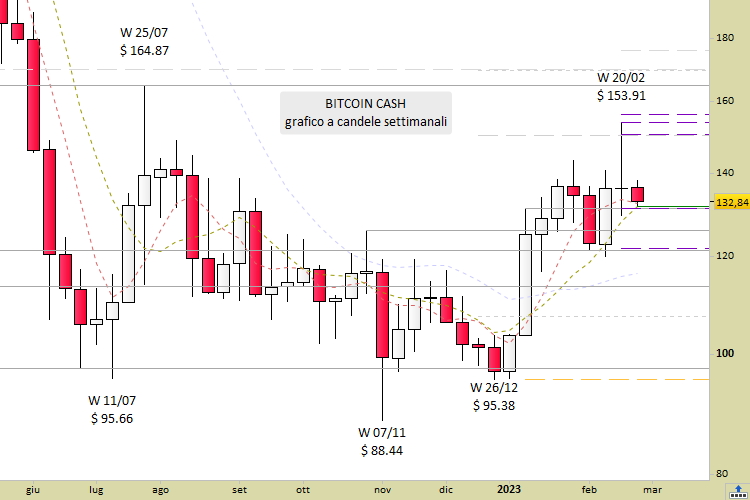 Possiamo subito rilevare come dopo l’aggiornamento più recente, datato 14 febbraio, Bitcoin Cash si sia mosso inizialmente al rialzo fra 122.92 e 153.91, raggiungendo il target rialzista che avevamo indicato fra 150/151.