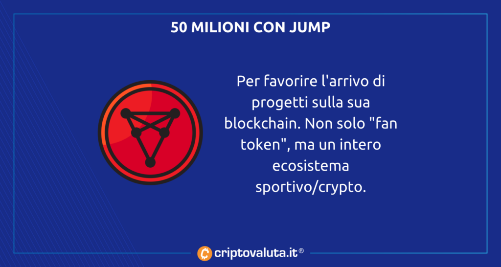 Da un lato Chiliz, dall’altro invece Jump Crypto, gestore e market maker che è uno dei più importanti player del settore cripto. 50 milioni di fondo che saranno assegnati a progetti che sceglieranno la blockchain di Chiliz per lo sviluppo dei propri progetti. Per quanto Chiliz sia legata quasi al 100% al mondo dello sport e dei fan token,il progetto sta cercando di svilupparsi anche in altro senso, ovvero cercando di attirare progetti terzi che facciano riferimento alla sua blockchain e che la sfruttino.