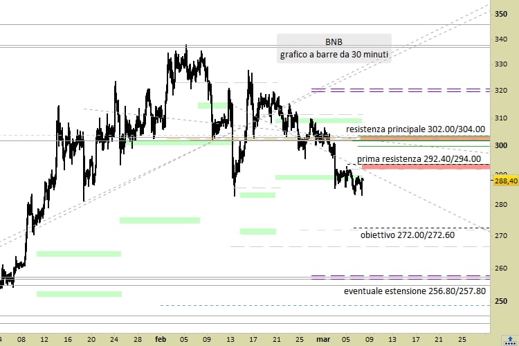 Le resistenze si trovano adesso a quota 292.40/294.00 ed a quota 302.00/304.00. Riteniamo probabile il raggiungimento di un obiettivo ribassista a quota 272.00/272.60. Se tale livello non si rivelasse sufficiente a contenere la pressione in vendita, sarebbe necessario spostare l’attenzione sul punto di verifica immediatamente inferiore, situato a 256.80/257.80. Lo scenario è subordinato alla tenuta delle resistenze e verrebbe annullato da una chiusura su grafico a 30 minuti superiore a quota 304.00. BNB è la quarta valuta digitale più capitalizzata a livello globale, ed è facilmente scambiabile su tutti i migliori Exchange.
