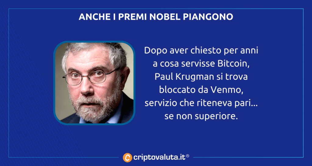 Il Premio Nobel in questione è Paul Krugman, la disavventura è avvenuta con un normalissimo account Venmo – una sorta di PayPal – e il blocco è stato effettivo, nonostante al Krugman non manchino le credenziali di onesto e rispettabile cittadino. E sì, spiacerà ripetersi ma Bitcoin fixes this, Bitcoin risolve proprio questo tipo di problemi.