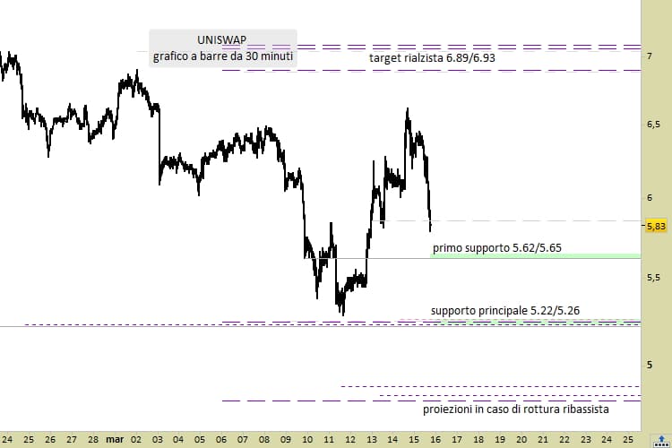 Mentre scriviamo sono le 18:09 di mercoledì 15 marzo, Uniswap viene scambiato a 5.83 dollari su tutti i migliori Exchange mondiali. La crypto ricopre attualmente il diciottesimo posto nel ranking tra le valute digitali più capitalizzate. I prezzi si possono già considerare adesso in zona d’acquisto, in quanto sufficientemente vicini all’area dei supporti.