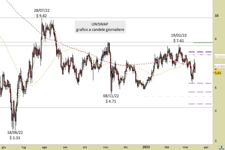 UNI/USD, grafico a candele giornaliere. Prezzi fino al 15/03/23, ore 17.53, last 5.81