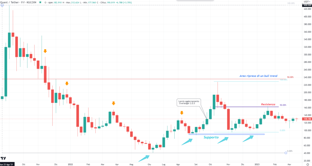 Passando ad un grafico daily, vediamo come Quant sia sceso dalla resistenza a 161$ fino al supporto statico a 104$. Questo è il vettore che comanda in questo frangente. Con l’ausilio di Fibonacci individuiamo la resistenza spartiacque che passa a 135$, dove si può cogliere che QNT si è già fermata più volte nelle ultime sedute.