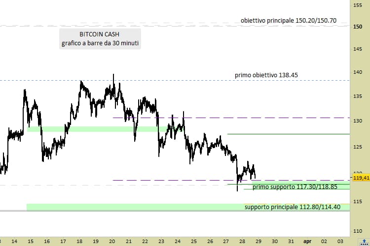 Osserviamo più da vicino la dinamica dell’azione dei prezzi nelle ultime sessioni, analizzando il grafico a scansione intraday, con barre da 30 minuti. Dopo il 14 marzo, BCH era riuscito ancora a spingersi al rialzo, fino a toccare il picco già menzionato di quota 139.65. La successiva flessione, però, ha determinato la violazione del primo livello di supporto che era stato fissato già fra i 128.60 ed i 130.00. I valori si sono quindi portati in forte avvicinamento a quota 112.80/114.40, ove era collocato il supporto principale di breve periodo.