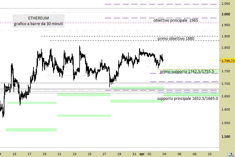 Le proiezioni indicano un obiettivo principale già attivo, confermato rispetto all’analisi del 27 marzo, a quota 1965.00. Sulla strada per tale livello è posta una prima fascia di resistenza/target intermedia, passante per quota 1880. Mentre scriviamo sono le ore 18:59 di lunedì 3 marzo ed Ethereum viene passato di mano sui migliori Exchange mondiali a 1795.13 dollari, del tutto stabile rispetto a domenica.