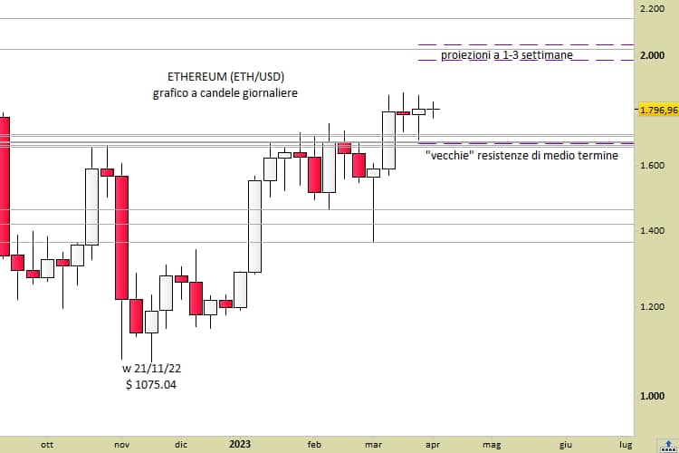 Come possiamo constatare adesso, osservando il grafico a candele settimanali, tale area è stata finalmente sfondata al rialzo solo durante l’ottava centrale dello scorso mese. L’attuale fase di stabilizzazione va interpretata come moto di consolidamento alla rottura rialzista. In altre parole, ETH sta costruendo nuove basi di appoggio su cui impostare un ulteriore allungo nel corso del mese di aprile.