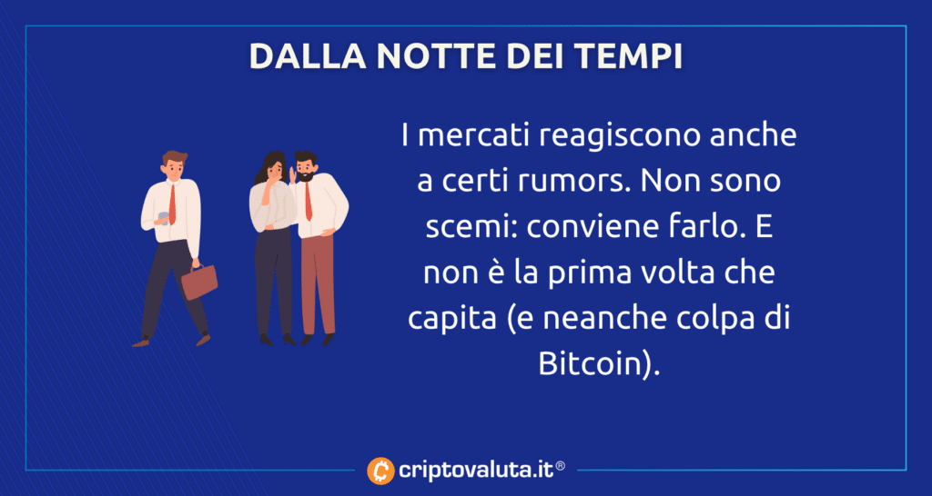 Questo approfondimento sarà un po’ particolare, perché pesta dalla storia anche recente dei mercati classici per dimostrare come il reagire a rumors non sia una prerogativa di Bitcoin.