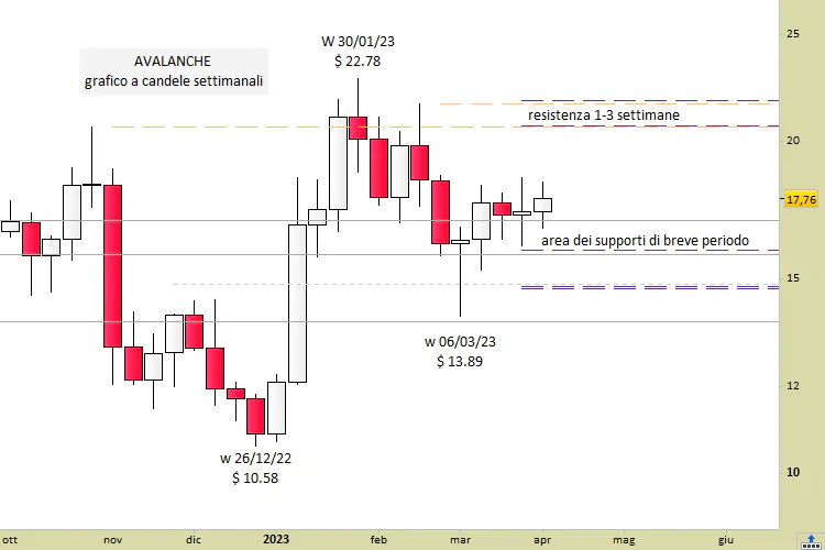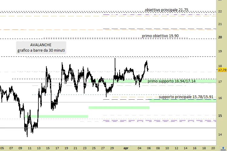 Mentre sono le 20.05 di mercoledì 5 aprile, Avalanche viene scambiato sui migliori Exchange mondiali a 17.80 dollari, con un incremento del +0.74% da ieri. I valori si trovano quindi già adesso in zona di potenziale acquisto. Da un punto di vista tecnico sarebbe infatti preferibile intervenire long solo da rilevazioni non superiori a quota 18.06.