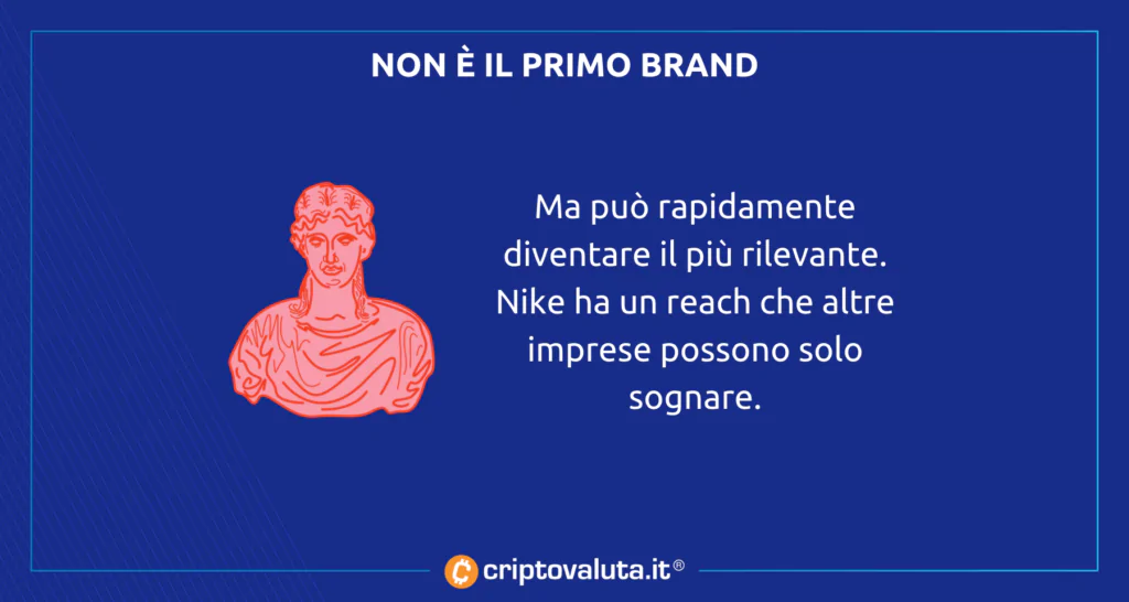 NIKE non è certamente il primo brand che procede con questo tipo di iniziative. Prima di lei hanno già riscosso un successo importante brand come Gucci, Dolce & Gabbana e tanti altri anche con target di prezzo decisamente più bassi. Riteniamo però che NIKE possa diventare nell’altro senso la prima, ovvero il brand che potrebbe guidare un’estensione delle possibilità offerte dai NFT ai grandi brand di abbigliamento, sportivi e non. Il reach di NIKE non è secondo a nessuno – così come non sarà seconda a nessuna la legittimazione per il settore che arriverà appunto da questa scelta del marchio americano.