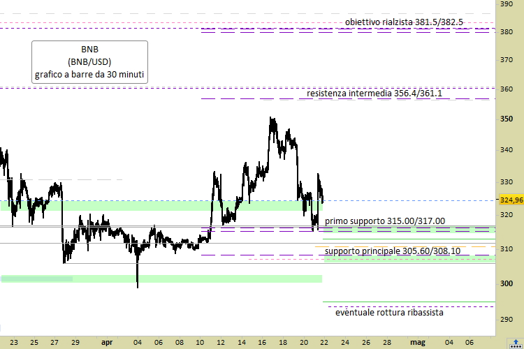 BNB occupa il quarto posto mondiale nella classifica degli asset crittografici più capitalizzati e conosciuti. Si tratta quindi di un mercato facilmente tradabile su tutti i migliori Exchange. Tecnicamente parlando, sarebbe preferibile intervenire long da rilevazioni in ogni caso non superiori a quota 334.00. Il segnale tecnico verrebbe rinnegato solo dall’eventuale cedimento di quota 305.60, meglio se confermata da almeno una chiusura su grafico a 30 minuti. Possiamo premettere che il livello di verifica immediatamente inferiore sarebbe, in quel caso, da ricercare tra 293.50 e 294.80.