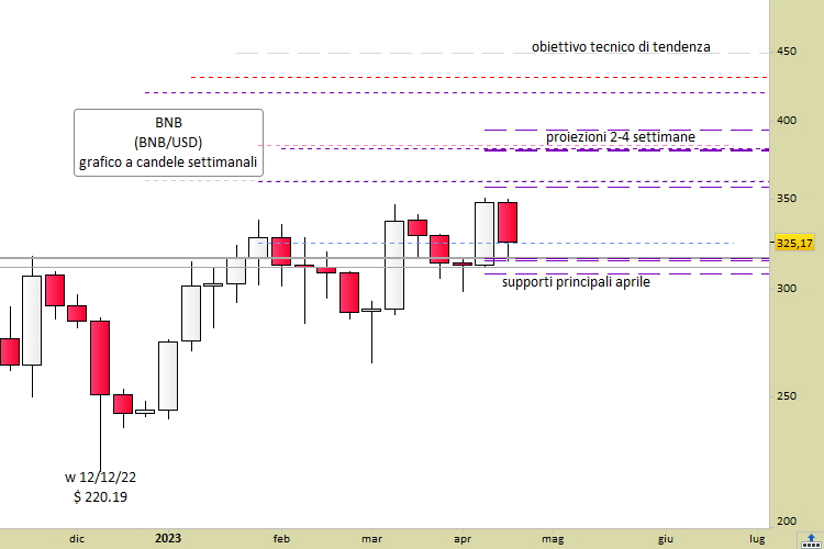 Le quotazioni di BNB (BNB) hanno raggiunto minimi relativi settimanali a quota 315.16 contro dollaro USA, durante la sessione di ieri 20 aprile. Si è trattato del punto più basso raggiunto dalla fase correttiva che sta scendendo per questo token dal picco di domenica 16 aprile, a quota 350.67. Per inciso, era dal 10 novembre dell’anno scorso che BNB non riusciva a riportarsi sopra alla linea dei 350.00 dollari.