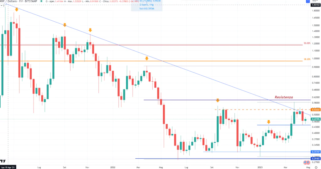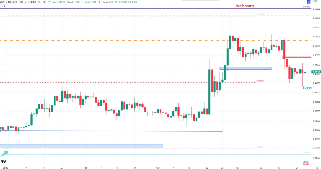 Tagliando il tempo e scendendo su un grafico daily, ci focalizziamo sull’andamento da inizio 2023. La parte più rilevante è quella del rialzo partito il 20 Marzo dalla zona di 0,37$ e che ha portato in 9 giorni, ad una crescita del 57%, toccando un massimo intraday a 0,58100$.