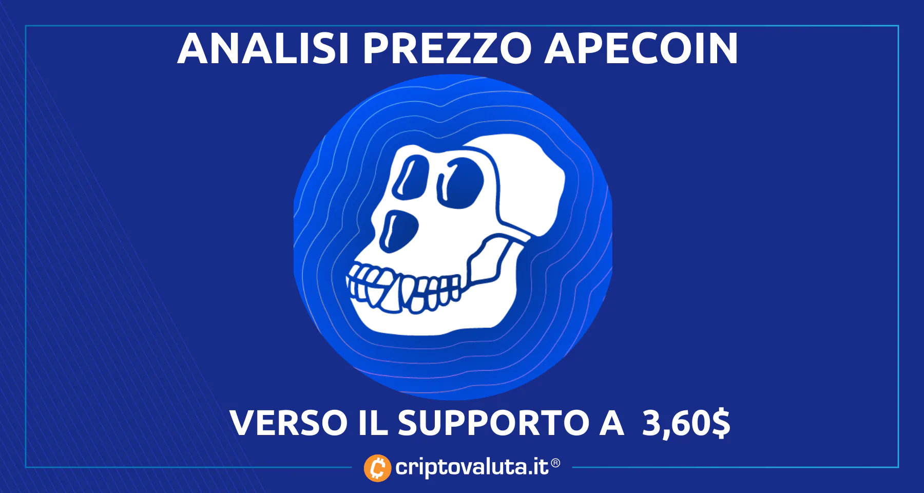 Sostanzialmente Apecoin è da inizio Marzo in una fase di lateralità in un range del 28%, compresso tra la resistenza – obiettivo a 4,66$ ed il minimo a 3,60$.