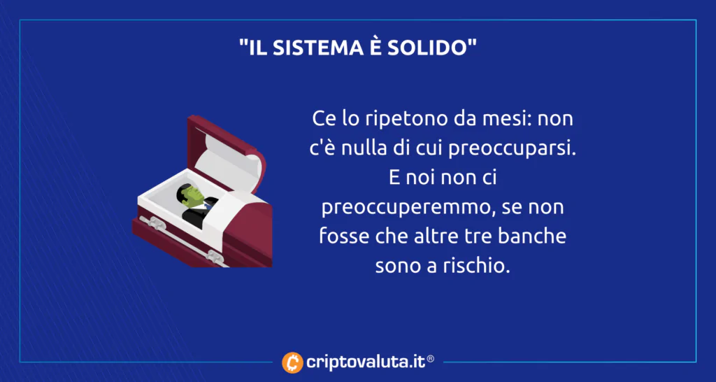 C’è del marcio nel sistema bancario USA, con la cura da cavallo a base di rialzi dei tassi repentini che ha mostrato nel giro di poche settimane chi è che, tra gli istituti bancari, stava nuotando nudo. E che ora corre a cercare un costume che nessuno è disposto più a prestargli.