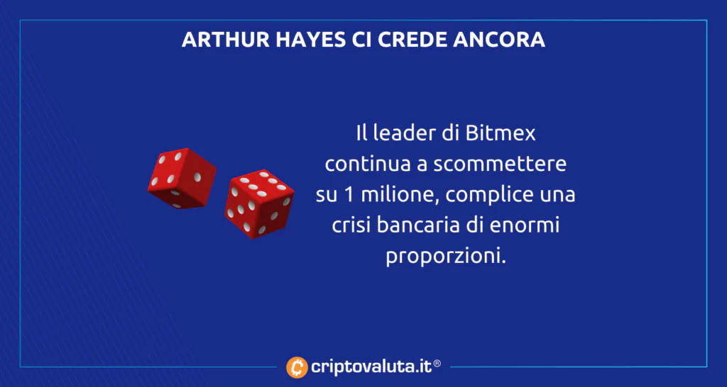 La previsione dell’ex dirigente di Coinbase è stata raccolta, almeno idealmente, da Arthur Hayes di BitMEX. Il noto imprenditore del mondo Bitcoin e delle criptovalute ha pubblicato un lungo thread sulla crisi di First Republic, indicando come possibile target di prezzo del Bitcoin proprio 1 milione.
