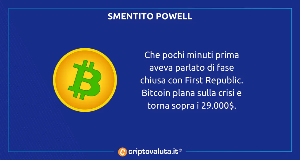 Bitcoin pimpante sulla scorta di ulteriori problemi per il settore bancario degli Stati Uniti. Le agenzie non avevano ancora battuto il sunto della conferenza stampa di Powell che diversi titoli di banche regionali e locali degli USA hanno iniziato a perdere quote importanti durante le contrattazioni post chiusura dei mercati.