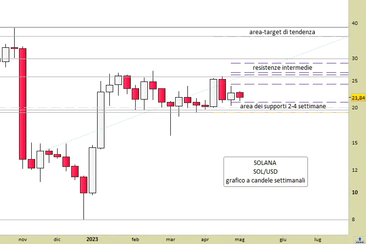 Le forti preoccupazioni che erano state espresse a proposito della sopravvivenza stessa di Solana dopo il caso FTX, preoccupazioni peraltro condivise dallo stesso fondatore Anatoly Yakovenko, non sembrano aver sortito un impatto decisivo sulla tenuta del trend. Siamo tornati sull’argomento proprio oggi, con un approfondimento sul sito. La stessa flessione scesa dal 17 al 26 aprile scorsi ha avuto dimensioni tutto sommato compatibili con la capacità correttiva già evidenziata in precedenza da questa crypto, almeno sin dai minimi relativi del 10 marzo scorso.