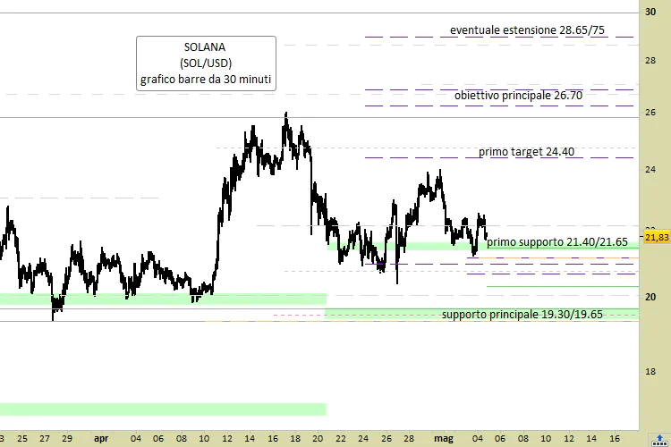 Quando sono le 19:50 di giovedì 4 maggio Solana viene scambiato sui migliori Exchange mondiali a 21.75 dollari, in calo del -2.20% da ieri. I valori si trovano quindi, già adesso, in zona tecnica di intervento long. Da un punto di vista del rapporto teorico tra rischio/beneficio, sarebbe preferibile intervenire da valori comunque non superiori a 22.17. Lo stop per il segnale tecnico descritto scatterebbe solo in caso di cedimento del supporto principale, mediante una chiusura su grafico a 30 minuti inferiore a 19.30.