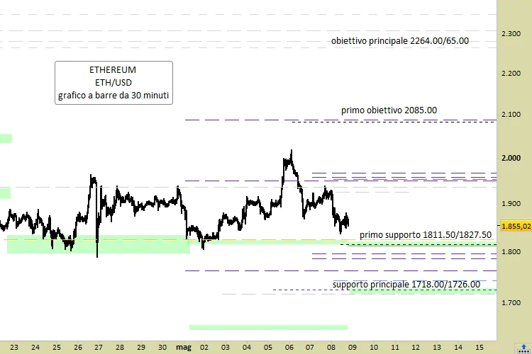 Le aspettative sono di raggiungimento in prima battuta dell’area di resistenza posta tra 1955.00/1970.00 e quindi di rottura della medesima, con proiezioni a 2085.00 e in seguito fino a 2264.00/65.00. Lo scenario tecnico descritto verrebbe accantonato solamente in caso di cedimento del supporto principale, mediante una chiusura su grafico a 30 minuti inferiore a quota 1718.00.