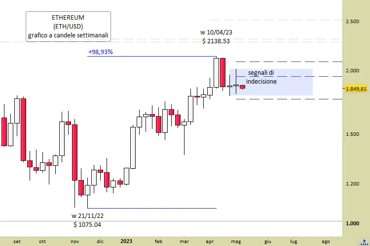 Le ultime due candele complete su grafico weekly hanno assunto la caratteristica forma che identifica le fasi di indecisione del mercato. Per la precisione, lo spazio compreso tra 1765.00 e 1950.00 è ancora passibile, durante la settimana in corso, di ripetuti cambi di tendenza al suo interno. Solo la violazione consolidata della linea dei 1765.00 potrebbe far scattare un primo campanello d’allarme, per quanto riguarda una possibile estensione della correzione fino alla zona dei 1680.00.