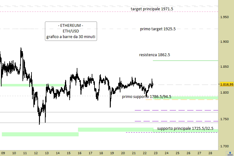 Mentre sono le 18:10 di lunedì 22 maggio, Ethereum viene scambiato sui migliori Exchange mondiali a 1816.86 dollari, in leggero guadagno da domenica (+0.63%). I valori si trovano quindi già adesso relativamente vicini ai supporti, in zona tecnica di acquisto. Guardando esclusivamente alla convenienza teorica fra rischio/beneficio, sarebbe preferibile intervenire long direttamente su test dei livelli tecnici, ma in ogni caso da rilevazioni non superiori a 1815.00.