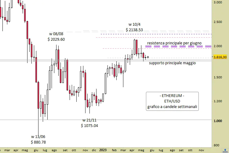 Rimanendo invece prettamente al quadro tecnico, è ben evidente su grafico a candele settimanali come i valori, già dalla seconda metà di aprile, si siano appoggiati poco sopra l’area di supporto principale per il mese di maggio. Le aspettative sono adesso di ripartenza in direzione delle resistenze a 2-4 settimane, che sono situate tutte a ridosso di quota 2000.00.