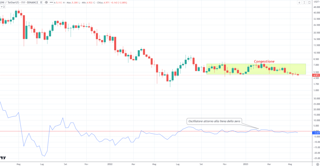 Quando il mercato si trova in una congestione laterale, l’oscillatore graviterà intorno alla linea dello zero generando una serie di continui falsi segnali. Lo possiamo verificare su Uniswap (UNI) nel grafico allegato su time frame weekly.