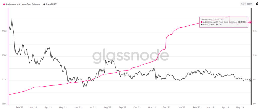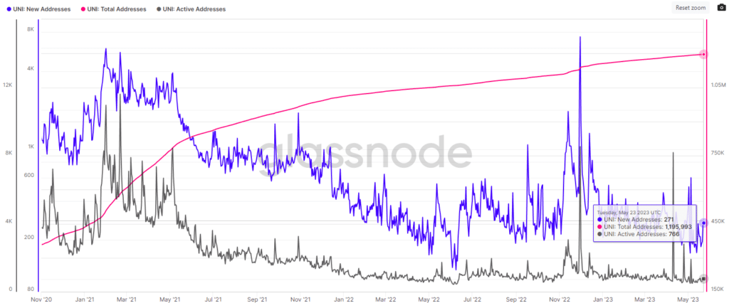 La crescita di UNI, come si può vedere dalle metriche on-chain, è stata costante nel corso di questi anni. Se guardiamo nel grafico allegato di Glassnoe, l’andamento degli indirizzi totali (linea fucsia) si nota anche un incremento ad inizio di questo Gennaio.