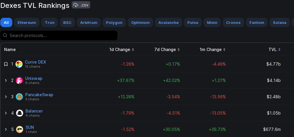 Attualmente Uniswap (UNI) è al secondo posto nella classifica dei DEX con una TVL (Total Value Locked) di 4,14 Miliardi di dollari, impiegati nei suoi servizi. Nell’immagine allegata di DefiLlama abbiamo il rankings dei primi 5 DEX.