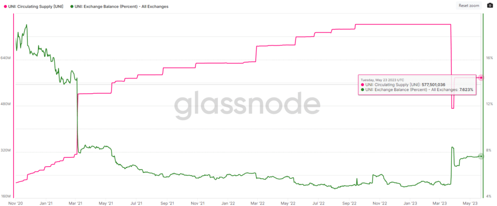 Attualmente la supply circolante del token UNI è di 557 Milioni su 1 Miliardo di token totali previsti dal protocollo. Dal grafico successivo, possiamo vedere che solo il 7,6% è detenuto prezzo indirizzi che risalgono agli exchange. Tra questi i due che detengono i depositi maggiori sono Binance e OKX. La maggior parte della supply è impegnata sul DEX od in servizi di staking.