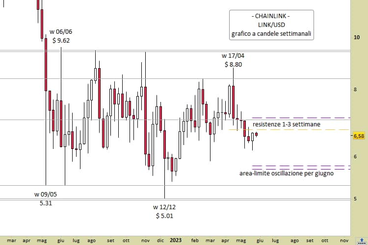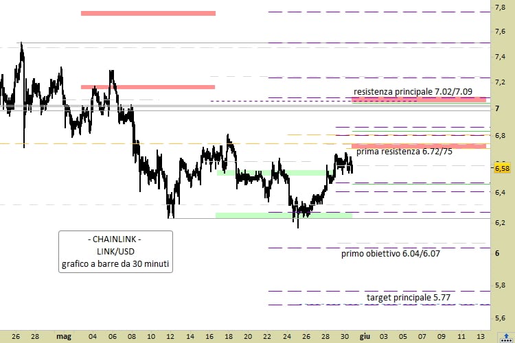 L’attuale scenario correttivo verrebbe accantonato solamente su eventuale rottura della resistenza principale, mediante almeno una chiusura su grafico a 30 minuti superiore a quota 7.09. Mentre sono le 19:13 di martedì 30 maggio, Chainlink viene scambiato sui migliori crypto Exchanges mondiali a 6.59, con un calo del -0.75% da ieri, e si trova quindi già adesso in area tecnica di vendita. Per intervenire short sarebbe preferibile agire solo su nuovi test almeno della prima resistenza, in ogni caso da rilevazione non inferiori a 6.59.