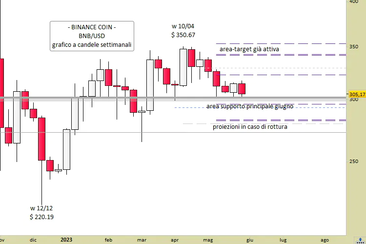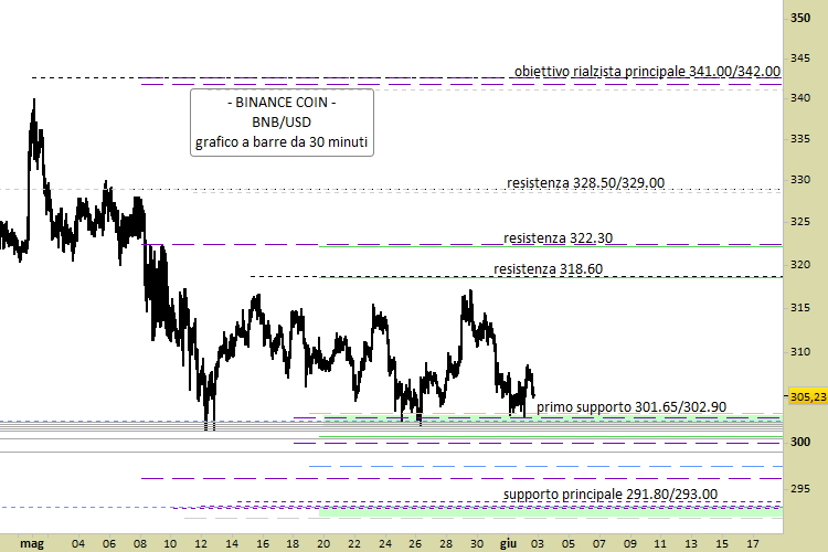 Quando sono le 16:34 di venerdì 2 giugno, BNB viene scambiato a 305.08 dollari, sostanzialmente stabile da ieri (+0.03%). I valori si trovano quindi già adesso in zona tecnica di acquisto, relativamente vicini al primo supporto. Lo scenario verrebbe messo in discussione solo dal cedimento consolidato di quota 291.80, ipotesi che consideriamo poco probabile. Dobbiamo comunque anticipare che, in tal caso, si avrebbe un primo affondo in direzione di 282.00/283.00.