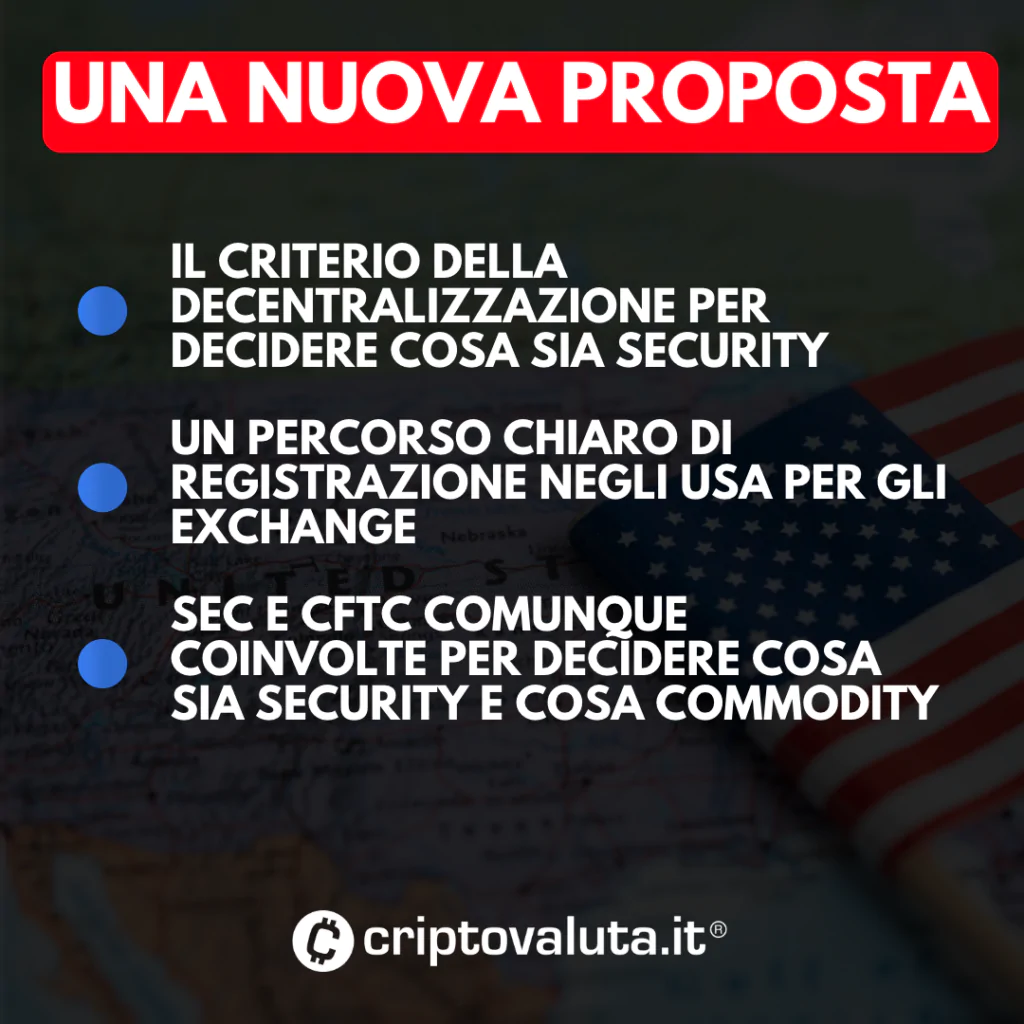 Si tratta di una base della quale si dovrà discutere e che – per intenzione stessa dei proponenti – sarà aperta a integrazioni anche da altri membri del Congresso. L’obiettivo è quello di avere una definizione chiara dei requisiti per un token affinché sia dichiarato una commodity e non una security.