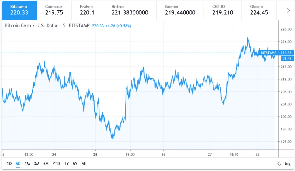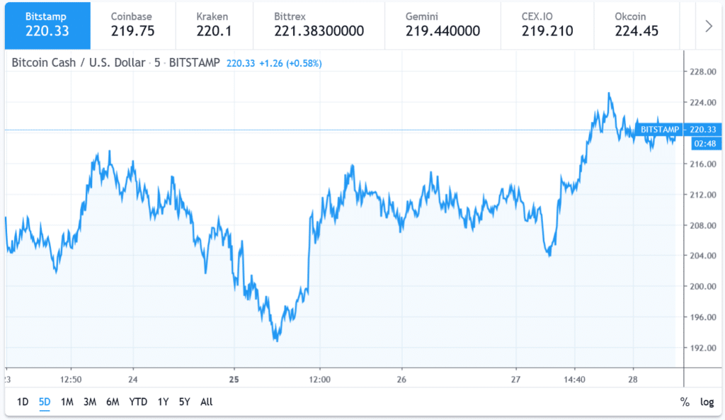 Mentre scriviamo, comunque, il prezzo sembra aver trovato un buon assestamento intorno ai 219 dollari, e potrebbe cercare nuovi rimbalzi verso la più interessante area di resistenza posta a 225 dollari. In termini più ristretti, la rottura sopra una resistenza intermedia di 222 dollari dovrebbe permettere a Bitcoin Cash di salire agevolmente sopra i 225 dollari.