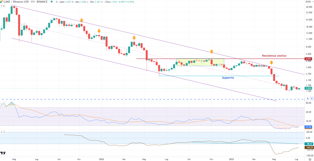 Passando alla situazione grafica di PancakeSwap, partiamo da un grafico weekly, dove abbiamo una panoramica dai massimi del Maggio’21 fino ad oggi. Qui è ben evidente il bearish trend primario tutt’ora in atto.