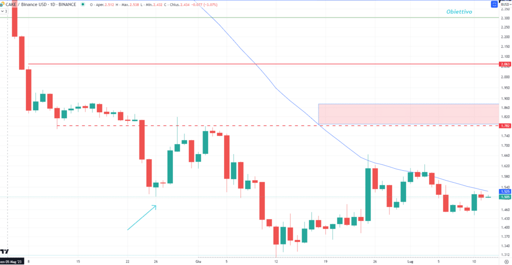 Una delle crypto che in questo 2023 sta avendo l’andamento peggiore è PancakeSwap (CAKE), che al prezzo attuale di 1,505$ da inizio anno è in rosso del -53%. I mesi peggiori sono stati Aprile e Maggio, solo a Gennaio aveva chiuso in positivo con un interessante +24%.
