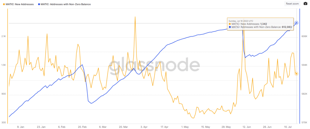 La ripartenza di Polygon, oltre che dal prezzo è confermata anche da alcune metriche di Glassnode, come il numero dei New Addresses e dei Addresses with No – Zero Balance che hanno ripreso a salire.