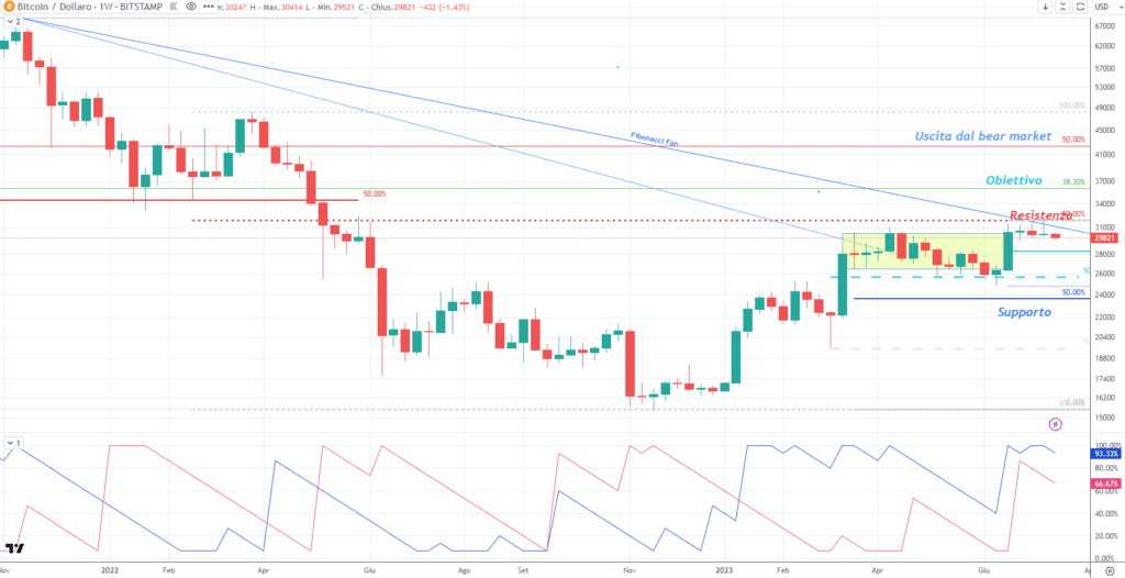 A scalare troviamo il livello supporto principale che passa a 23.500 – 23.600$. Questo livello corrisponde al 50% di Fibonacci del vettore che parte dai minimi fatti da BCT a Novembre’22 al prezzo di 15.479$ fino al massimo della settimana scorsa a 31.818$.