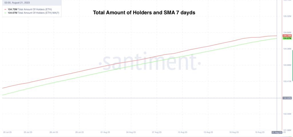 Sicuramente è un dato importante, che al momento non è possibile smontare, così come l’altra metrica relativa a chi decide di accumulare ETH, che possiamo vedere tramite il Total Amount of Holders, che continua a crescere, anche se c’è un leggero rallentamento, come si può vedere dall’avvicinamento della linea rossa alla sua media a 7 giorni.