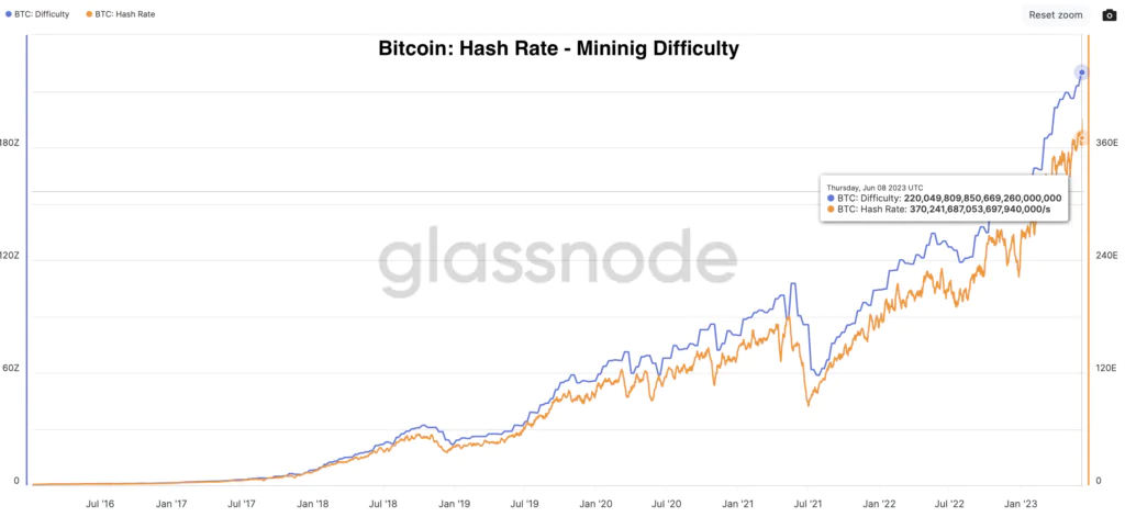 Il più delle volte l’hashrate va in coppia con quella che è la Bitcoin: Mining Difficulty. Misura il livello di difficoltà computazionale richiesto per risolvere con successo i problemi crittografici per poter minare e registrare i blocchi sulla blockchain. Il protocollo periodicamente regolata automaticamente il tempo medio necessario per estrarre 1 BTC, che deve rimanere stabile in un range di 600 secondi, in questo caso si parla di Difficulty Adjustmen.