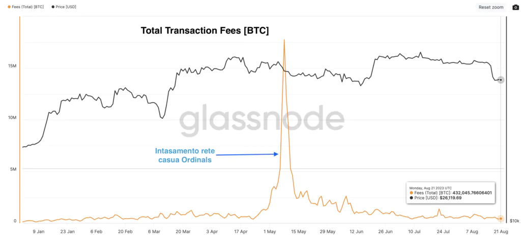 Nel momento che il prezzo inizia anche a scendere, si trovano difronte a difficoltà di mantenimento. Infatti da altri dati di Glassnode possiamo constatare che stanno subendo una diminuzione delle fee di transazione.