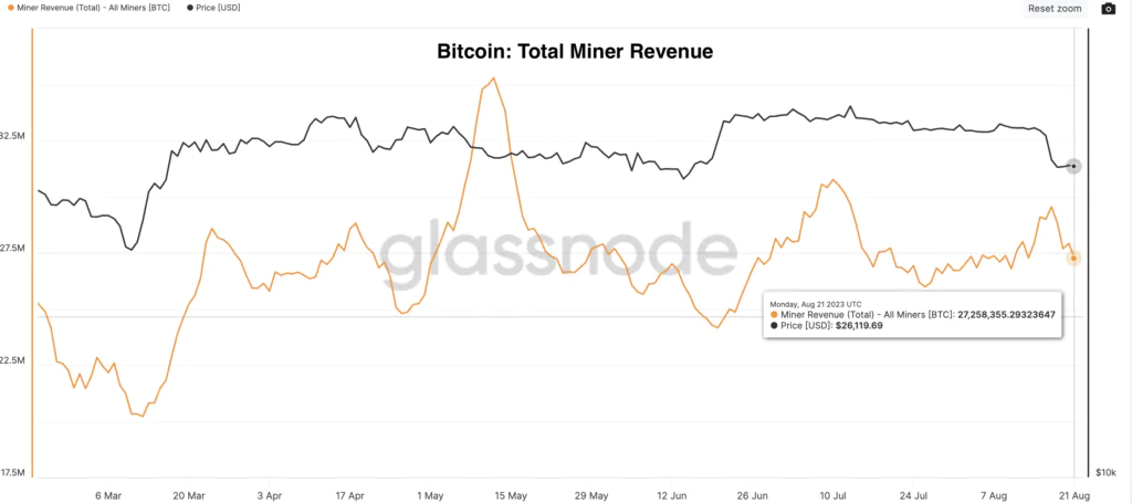 Dalla metrica sulle Total Transaction Fees, vediamo che le commissioni pagate ai miners attualmente si attestano a 26.116$, mentre la settimana scorsa erano scese al minimo di 5 mesi pari 21.256 dollari. Ciò ha iniziato ad avere un impatto negativo sui guadagni totlai, come si può vedere dal Bitcoin: Total Miner Revenue.