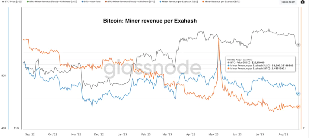 Un quadro ancor più dettagliato della situazione, lo possiamo avere tramite un’altra metrica elaborata dal Glassnode, che è il Miner revenue per Exahash.
