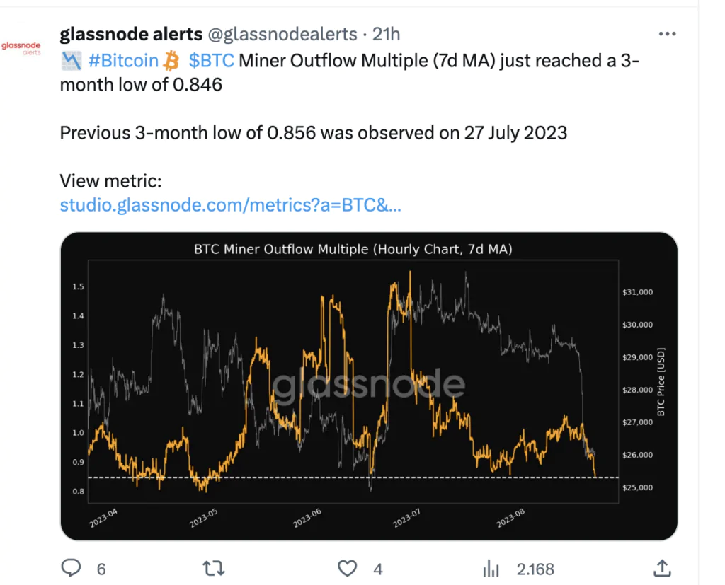 Altro discorso è per i miners più grossi che riescono al momento da affrontare la situazione senza problematiche. Tramite un’altra metrica elaborata dall’ufficio studi di Glassnode, il Miner Outflow Multiple e pubblicata sul loro Twitter, possiamo vedere che il saldo dei BTC estratti dai miners in questo periodo sta aumentando.