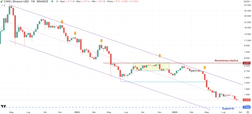 Dal punto di vista grafico, partiamo da un chart weekly di Pancake, dove abbiamo una panoramica dai massimi fatti a Maggio’21 fino a oggi. Il bearish trend primario è ben evidente, così come il canale ribassista all’interno di cui si sta muovendo.