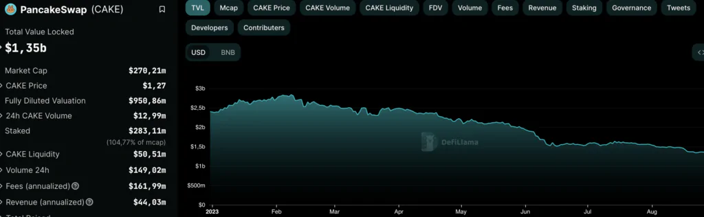 Altro dato estremamente rilevante per PancakeSwap è quello relativo all’andamento della TVL (Total Value Locked). Nell’immagine allegata del sito DeFiLlama, vediamo l’andamento da inizio 2023, dove dagli iniziali 2,4 Miliardi di dollari, è scesa agli attuali 1,35 Mld, di oltre il 40%. Nello stesso arco di tempo invece la TVL Totale della DeFi è in contrazione di circa un 3%.