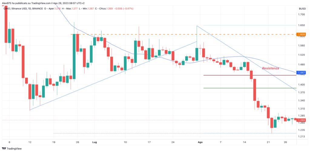 Ci limitiamo a indicare, un livello di resistenza in area 1,45$ che deve essere superato, perché si possa iniziare a ragionare sulla forza di un rimbalzo di PancakeSwap. Senza questo break out possiamo considerare gli altri movimenti, come rimbalzi del gatto morto.