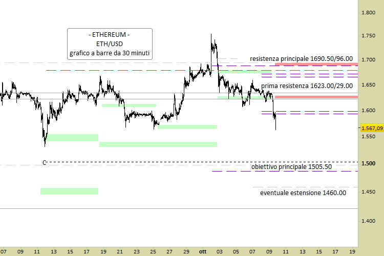 Prima di procedere in direzione degli obiettivi indicati, i prezzi dovranno probabilmente effettuare un provvisorio riavvicinamento alla zona delle resistenze, ognuna delle quali costituisce luogo di potenziale intervento dei venditori. Lo scenario verrebbe annullato solo da un’eventuale chiusura su grafico a 30 minuti superiore a 1696.00. Indicazioni tecniche su tutte le principali cryptovalute vengono diramate quotidianamente dal nostro canale Telegram ufficiale.